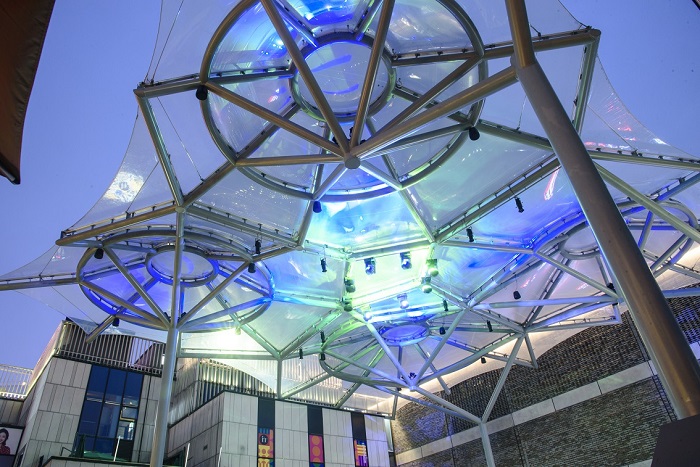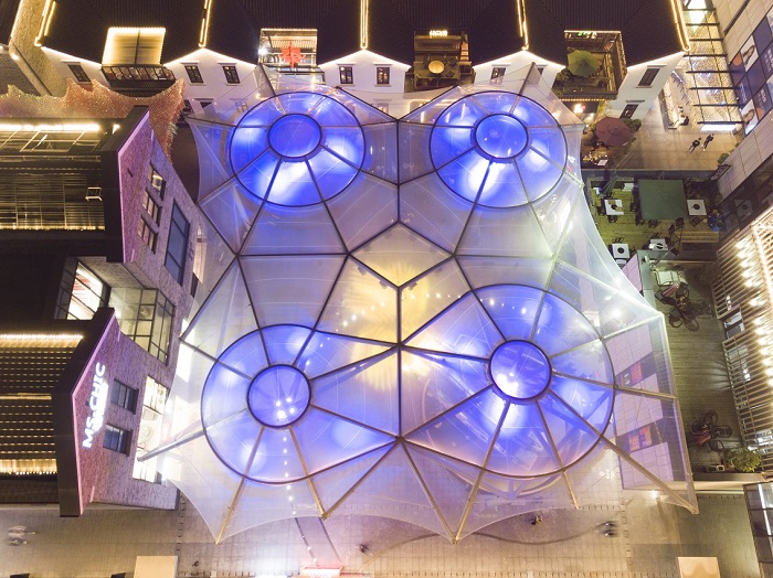工程特點(diǎn):該項目是國內(nèi)首個單層ETFE加雙層氣枕膜完美嵌合的景觀雨棚建筑,利用ETFE膜材的高透光高自潔性以及雙層氣枕的隔熱能力,雨棚在具有遮陽擋雨功能的同時還可以實(shí)現(xiàn)自然采光,行人沒有傳統(tǒng)密封建筑的束縛感;另一方面,ETFE膜結(jié)構(gòu)建筑是當(dāng)代最新的建筑應(yīng)用形式之一,工程高度定制,顏值高,具有唯一性,天生自帶聚集人氣光環(huán)。