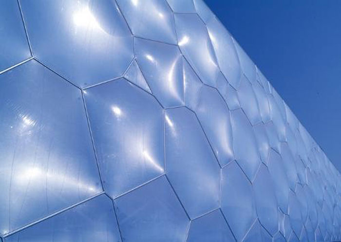 作為大型比賽場館的建筑材料用ETFE膜,更大的優(yōu)勢還在于它們可以加工成任何尺寸和形狀,滿足大跨度的需求,節(jié)省了中間支承結(jié)構(gòu)。作為一種充氣后使用的材料,它可以通過控制充氣量的多少,對遮光度和透光性進行調(diào)節(jié),有效地利用自然光,節(jié)省能源,同時起到保溫隔熱作用。