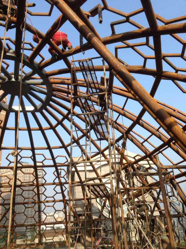 專業(yè)防銹加工處理:深圳燁興的每一個工作,其鋼結(jié)構(gòu)部件都要在我們指定的資質(zhì)合格的加工廠進(jìn)行加工成型,然后景觀噴砂打磨以后才按順序上漆防銹。這個過程比直接在現(xiàn)場加工成型的的鋼結(jié)構(gòu)更加優(yōu)美耐用,防銹效果能達(dá)到5年以上。這個過程,最是考驗企業(yè)良心的時候,省步驟只做表面工程會省很多錢,是差價產(chǎn)生的主要原因。