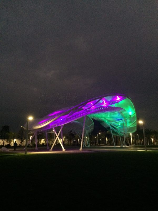 燁興提示:生活中,我們接觸最多的膜結(jié)構(gòu)建筑是公交站臺或者人行天橋那灰黑的擋雨棚,這些因?yàn)樘厥庥猛径舭宥宦傻恼九_雨亭成了人們對膜結(jié)構(gòu)的主流觀感。最近,最高人民法院再審改判聶樹斌無罪,22年后終于為其無罪正名,在此,燁興小編也想給膜結(jié)構(gòu)正一下名,用我們公司最近完成的一個作品讓大家從新認(rèn)識一下膜結(jié)構(gòu)的色彩,有興趣的就來欣賞一下我們這個膜結(jié)構(gòu)的百變風(fēng)情吧。