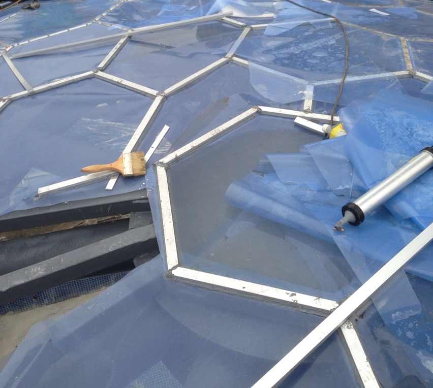 污漬也是膜結(jié)構(gòu)工程中常見(jiàn)的疵病,特別是在早期選用PVC膜材建成的一些膜結(jié)構(gòu)工程。原因主要是設(shè)于膜材外的PVC涂層隨時(shí)間推移老化、剝落所致。由于制作安裝缺陷導(dǎo)致膜面在焊縫處留下污漬或不慎利物刮劃涂層,使織物直接接受紫外線的作用,時(shí)間久了也會(huì)出現(xiàn)局部污漬。