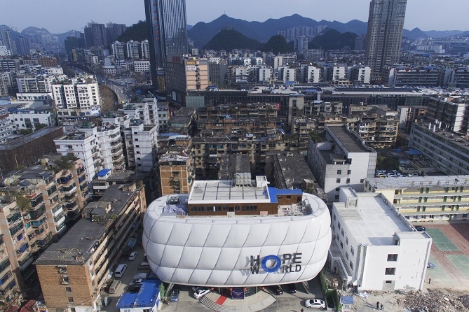 貴陽飛機(jī)壩售樓中心ETFE氣枕膜結(jié)構(gòu)工程,是典型的屋面膜結(jié)構(gòu)。它是貴陽火車站飛機(jī)壩棚戶區(qū)城中村改造項目的起始標(biāo)志。作為一個地標(biāo)性的售樓中心,開發(fā)商覺得單單用傳統(tǒng)建筑建設(shè),沒有什么新意,很難起到很好的宣傳促進(jìn)作用,經(jīng)過考察研究,最終決定在整座小樓外加裝膜結(jié)構(gòu)屋面。在一片老舊的棚戶中間,一座嶄新明亮的橢圓形膜結(jié)構(gòu)建筑挺立其中,給人一種眼前一亮的視覺震撼感,極大地提高了投資者及原住民對舊城改造成功的信心。
