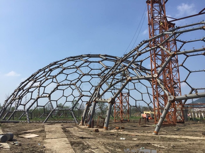 連云港薔薇湖畔的膜結(jié)構(gòu)工地,第一個(gè)鋼結(jié)構(gòu)半球型支架正在進(jìn)行鋁壓板的最后校正,第二個(gè)半球形鋼結(jié)構(gòu)也已拼裝到尾聲,而在鋼鐵加工廠的制作臺(tái)上,第三個(gè)半球鋼結(jié)構(gòu)部件也處于待加工狀態(tài)。目前我們?nèi)淌苤胰崭邷?,但是?dāng)這個(gè)ETFE氣枕膜項(xiàng)目完工后,薔薇湖畔將多出一個(gè)清涼的大型室內(nèi)植物科技展示館。