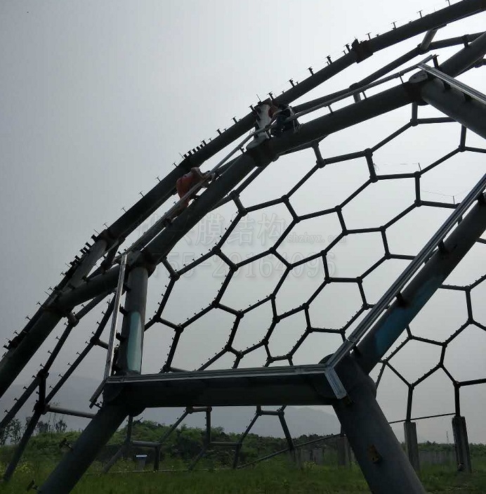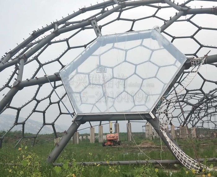 燁興連云港薔薇湖ETFE膜結(jié)構(gòu)生態(tài)園項目,一期工程9416平方米,外形是三個連接在一起的半球空間,此次初裝膜的是1#球(直徑跨度60米)。