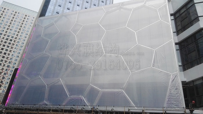 西寧唐道ETFE膜結(jié)構(gòu)項(xiàng)目,膜結(jié)構(gòu)單元全部采用無(wú)色透明氣枕膜。這種ETFE氣枕膜的最大特點(diǎn)是,白天干凈剔透,既能大量采光,又能保溫隔熱;夜晚,純色的膜泡能完美地將LED彩燈釋放的色彩渲染出來(lái),艷麗非凡。