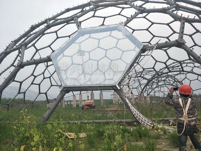 ETFE膜材既薄且透,材質(zhì)柔軟,無論單層使用還是加工成氣枕形式,都需要高強度的支撐結(jié)構(gòu)。為了使ETFE膜結(jié)構(gòu)建筑看起來更有藝術(shù)美感,一般是用泰森多邊形法來設計ETFE膜結(jié)構(gòu)單元的形狀和排布。將膜結(jié)構(gòu)單元加工完成以后,安裝工序能否做好,關(guān)系著整個工程的美觀程度及工程質(zhì)量。