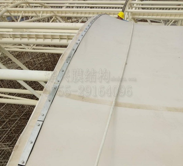 膜材與鋼索可以單邊或雙邊連接。簡單的連接方法是將鋼索穿入熱合好的膜套中。對重要工程,可采用鋁合金或不銹鋼夾板和連接件來連接膜材與鋼索。