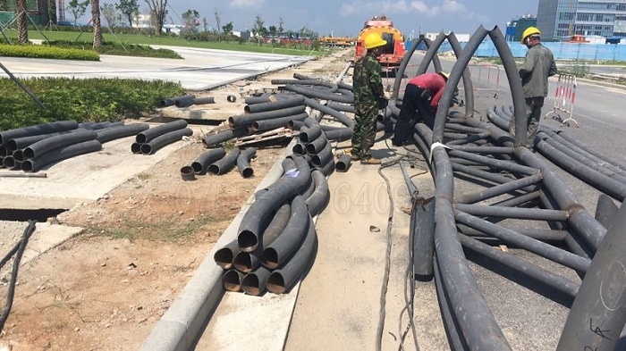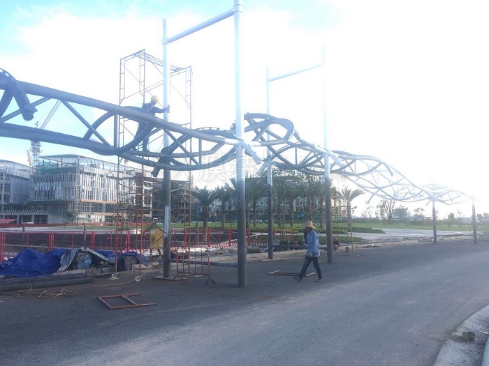“玉龍出海”造型的長廊采用骨架式膜結(jié)構(gòu),兩座膜結(jié)構(gòu)建筑總面積四百多平方米,體量雖小,但為了追求最好的工程效果,其鋼構(gòu)部件全部都在我們的鋼鐵加工廠經(jīng)過嚴(yán)格的加工工序精制而成,再運(yùn)輸?shù)浆F(xiàn)場(chǎng)進(jìn)行安裝拼接。如今雖然兩座廊橋的鋼結(jié)構(gòu)已吊裝完成,準(zhǔn)備裝膜。