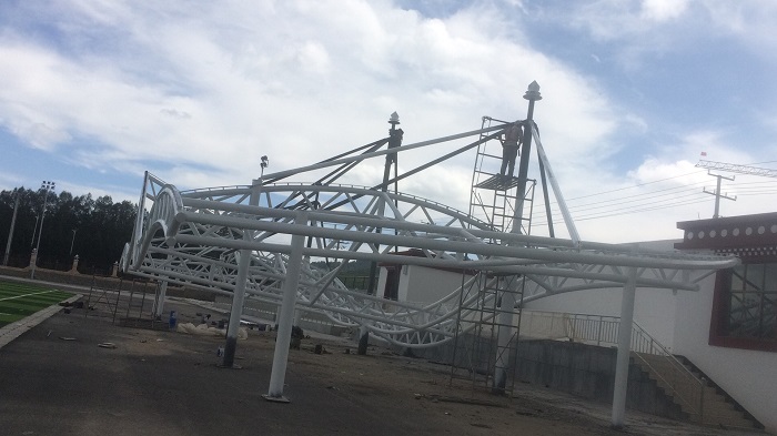 燁興-甘南體育看臺(tái)是深圳市燁興膜結(jié)構(gòu)工程有限公司為甘肅甘南州中等職業(yè)學(xué)校打造的膜結(jié)構(gòu)體育看臺(tái),項(xiàng)目設(shè)計(jì)、施工及相關(guān)材料服務(wù)都是由燁興膜結(jié)構(gòu)提供。目前,項(xiàng)目鋼結(jié)構(gòu)已經(jīng)在現(xiàn)場(chǎng)拼裝完成,正等待吊裝到位,然后進(jìn)行膜布張拉。