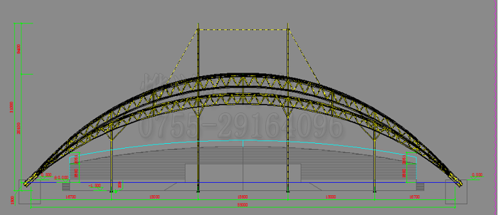 吉安體育場鋼膜結構工程最大建筑高度為 31 m,長89米(示意圖如下所示),建筑層數(shù)為1層,結構形式采用鋼膜結構,工程面積1858平方米,基礎形式為鋼筋混凝土基礎,兩者采取同心異徑管連接方式,抗震設防烈度6 級。