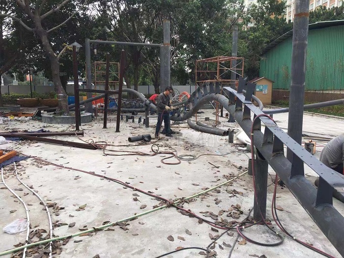 在施工方面,細(xì)節(jié)把控很重要。兒童公園這樣的場(chǎng)地,小孩子跑動(dòng)打鬧是很頻繁的,非常容易發(fā)生碰撞或者摔倒事件。所以在施工中,我們一定要根據(jù)現(xiàn)場(chǎng)環(huán)境,靈巧地將支撐鋼構(gòu)融入現(xiàn)場(chǎng)設(shè)施中,降低支撐結(jié)構(gòu)的存在感,減少接觸面,做一些防護(hù)設(shè)施降低熊孩子的攀爬欲望。特別注意的是,現(xiàn)場(chǎng)鋼構(gòu)拼裝完工后,一定要檢查打磨毛刺或者其它尖銳突出點(diǎn),防止觸碰受傷。