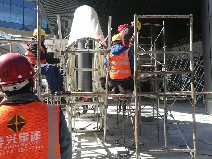 山東省運會濟寧服務(wù)中心膜結(jié)構(gòu)項目,工程要求是給大廈外圍的所有廊道承重柱進行防護包裝。傳統(tǒng)的承重柱防護包裝,一般是在水泥柱上加裝具有金屬質(zhì)感的防護板,能讓建筑顯得更加莊嚴厚重,但運用在較細的柱子上時,按標(biāo)準(zhǔn)厚度建造會顯得很單薄,特意加厚則會增加非常多的成本,塑形也不好看。我們燁興膜結(jié)構(gòu)給出的解決方案是:給這些較細的承重柱子加裝一個由鋼膜結(jié)構(gòu)的箱體,其中的鋼結(jié)構(gòu)承擔(dān)防護,膜結(jié)構(gòu)則起到美化包裝作用。