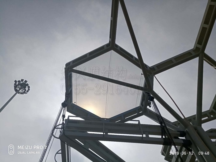 從上圖中我們可以看到,新裝的ETEF氣枕單元成型完美,外觀飽滿無褶皺,從地面往上看通透晶瑩,水泡感滿溢。另外,整個單元與底座高度契合,六角形的六個邊線鋁壓板與外圍邊框間隙邊線都相互平行。這些細(xì)節(jié)傳遞出了許多信息,一是我們的鋼結(jié)構(gòu)加工符合工藝標(biāo)準(zhǔn),二是我們現(xiàn)場的測量人員數(shù)據(jù)收集準(zhǔn)確,三是ETFE膜裁剪加工沒有問題,只有全部參數(shù)都符合標(biāo)準(zhǔn),才能做出這樣完美的ETFE氣枕。