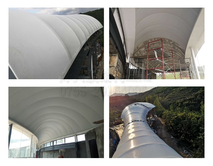工程介紹:泰安書吧膜結構工程是一個集觀景、閱讀、休閑娛樂于一體的綜合項目,既有膜結構建筑本身的現(xiàn)代化氣息,又有設計者及建造者高超技藝賦予的精致典雅,給人一種時尚別致卻又內(nèi)斂質(zhì)樸的觀感。本工程建筑屋面為流線形,建筑面積約600平米。外膜采用德國進口白色環(huán)保膜材,內(nèi)膜采用PTFE內(nèi)膜,中間加保溫隔熱層,內(nèi)膜需要安裝燈光。屋面以下為全封閉空間,墻體采用落地玻璃形式,從各個角度都能獲得極佳的視野效果