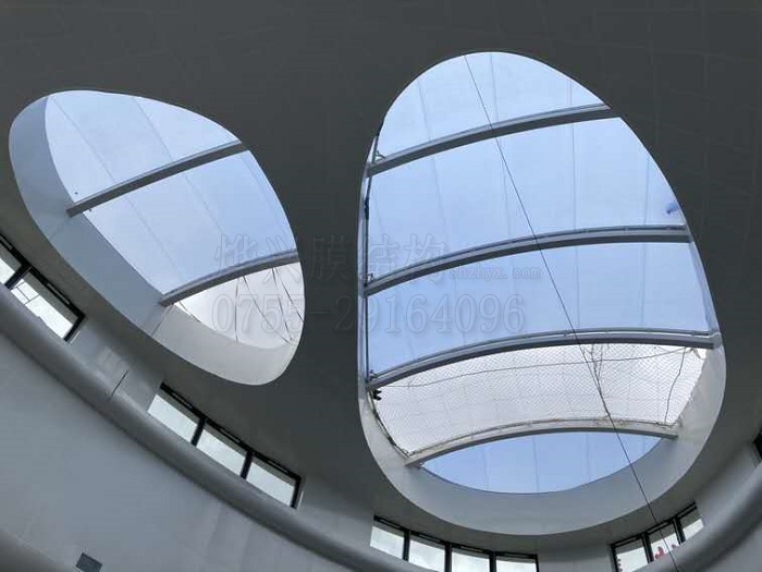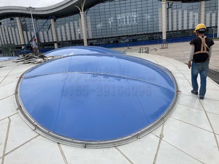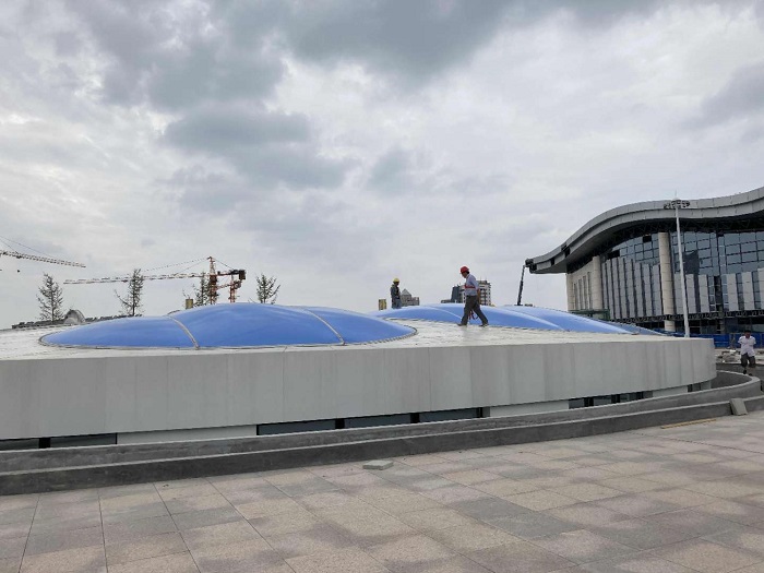 山東濰坊高鐵站ETFE膜結(jié)構(gòu)裝飾屋面是一個(gè)有故事的項(xiàng)目,屬于高鐵站前的地下廣場(chǎng)的采光頂屋面。作為一個(gè)人流量巨大的高鐵站配套項(xiàng)目,需要考慮安全、環(huán)保、節(jié)能等因素,于是ETFE膜結(jié)構(gòu)的制作方案很快就被各方認(rèn)可。當(dāng)初有人建議說要使用玻璃方案,但最終被否決了,原因是作為地下廣場(chǎng)的采光屋面,與外部地面基本平齊,用玻璃的話需要用較厚重的鋼化玻璃,需要投入更多的結(jié)構(gòu)承重預(yù)算;玻璃只能做成平面的普通天窗,不能做出ETFE那種美麗的高弧度氣泡效果,高鐵站屬于地標(biāo)建筑,需要美麗可靠的特殊建筑進(jìn)行點(diǎn)綴。