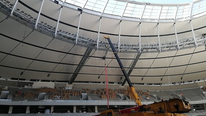 8月25日下午15:03,隨著現(xiàn)場調(diào)度的起吊指令下達,上海浦東足球場最后一塊膜結(jié)構(gòu)單元在兩臺大型起重車的配合下緩緩上升,將剩下的缺口補齊,至此,上海浦東足球場膜結(jié)構(gòu)單元吊裝工作宣告全部完成。
