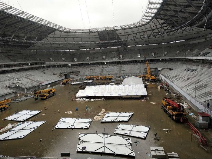 中國的基建速度為啥那么快,是因為中國工人敢拼能干!上面命令一下,下雨天也要創(chuàng)造條件繼續(xù)推進工程進度。很多做膜結(jié)構(gòu)的人,習(xí)慣穿防滑鞋在高空作業(yè)之后,估計很難想象有一天自己要像泥水建筑工一般,日常要穿水靴作業(yè),這次我們的施工人員就體驗到了。今年上海雨水天氣多,未完工的足球場排水還沒做好,每次下雨,工程車一輾軋,現(xiàn)場就變成泥漿沒過鞋面的水洼地,非水靴不能下腳,行動過程中還要防止泥水污染到現(xiàn)場的儀器和材料,非常不便!