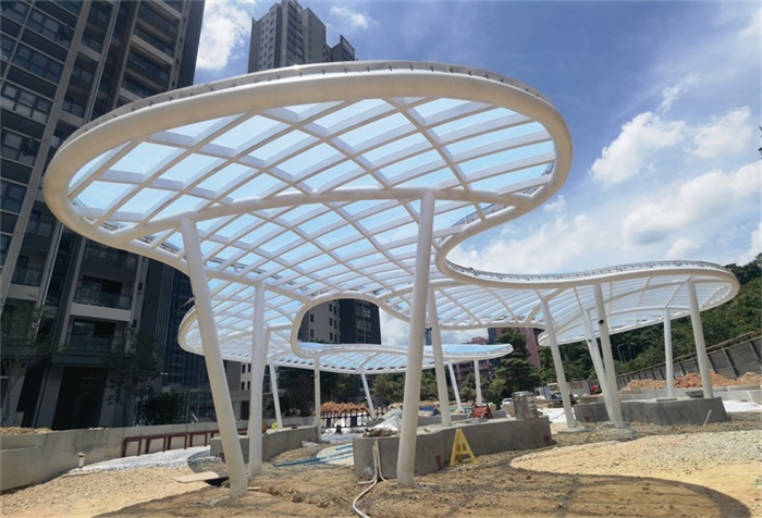 “雙魚亭”位于深圳鹽田太平洋工業(yè)區(qū)公園綠地一角,實(shí)地查看可知,現(xiàn)場有工人正在進(jìn)行地面的裝飾和綠化配套,我們鋼膜結(jié)構(gòu)部分的工作已經(jīng)完工撤場。
