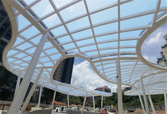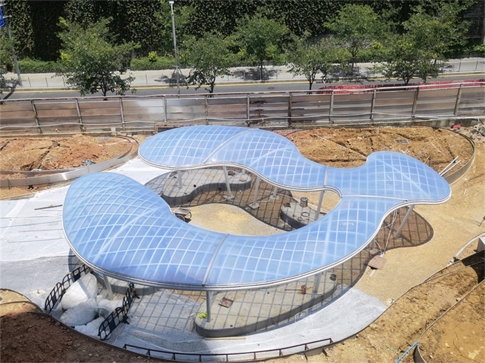 遠(yuǎn)遠(yuǎn)看去,“雙魚亭”ETFE膜結(jié)構(gòu)雨棚就像一條被風(fēng)吹得蜿蜒舞動(dòng)的藍(lán)色飄帶,也會(huì)被人誤當(dāng)做一灣藍(lán)色水塘;走到近處,第一眼會(huì)被別致有序的鋼結(jié)構(gòu)骨架吸引,迫不及待地想湊近去欣賞;在涼亭底下抬頭向上望去,面漆飽滿均勻的白色鋼構(gòu)看著很舒服,被藍(lán)色ETFE膜過濾一遍的烈陽已經(jīng)不再刺眼,能清晰看到白云點(diǎn)綴的湛藍(lán)天空。