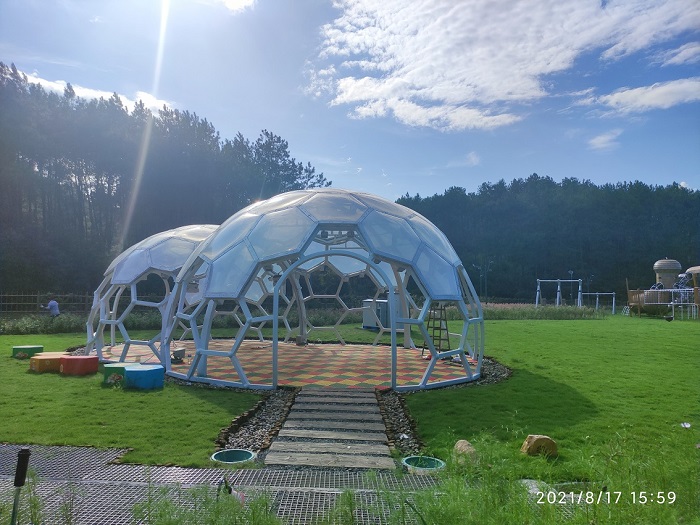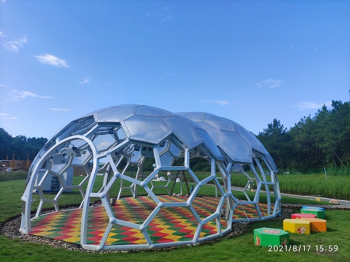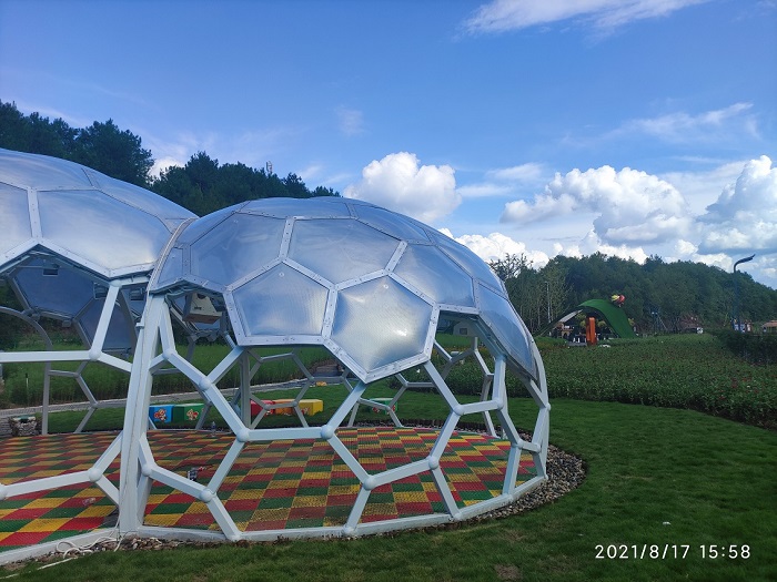 工程特點:該項目是黃山景區(qū)花山謎窟花山花海主題園內的一個ETFE膜結構藝術景觀工程,目的是打造一個高顏值的游客拍照打卡地點。黃山花山謎窟藝術景觀整體是兩個緊鄰的半球形鋼結構大氣泡,用泰森多邊形將兩個鋼結構殼體分成若干具有藝術視覺的單元,然后再用ETFE氣枕膜將殼體的上半部分覆蓋,形成一個給人強烈氣泡感的半敞開鋼結構涼亭景觀。