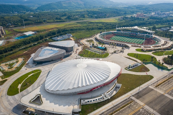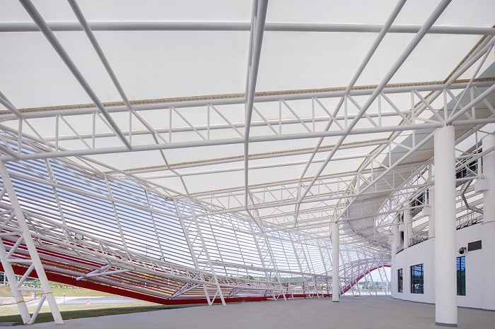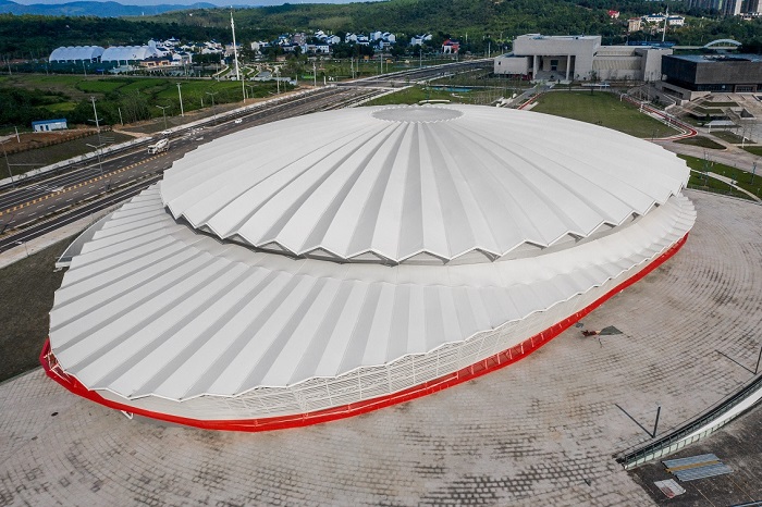 工程特點(diǎn):京山國際網(wǎng)球賽事中心膜結(jié)構(gòu)館,外形是兩個(gè)疊在一起的潔白扇貝殼,設(shè)計(jì)使用壽命在20年以上,能有效抵御9級(jí)以下地震。球館采用鋼結(jié)構(gòu)加PTFE膜的形式,內(nèi)部是寬敞的無立柱空間,各個(gè)座位的觀眾都能獲得良好的觀賽體驗(yàn);頂部的PTFE膜在將大部分紫外線紅外線隔絕之后,落在場(chǎng)館內(nèi)的是溫和的自然光,使場(chǎng)館內(nèi)白天時(shí)不開燈也光線明亮,比傳統(tǒng)的封閉建筑節(jié)能30%以上。